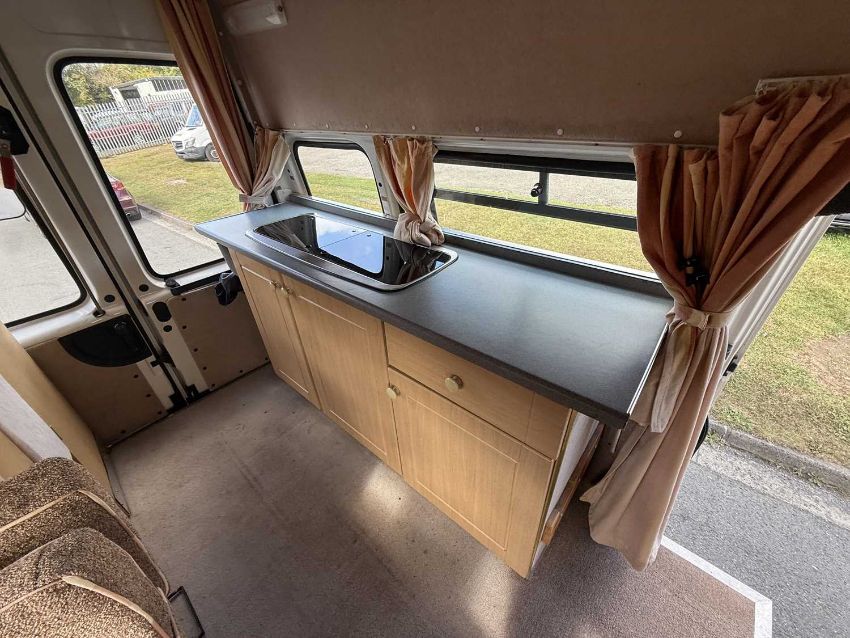 Fitted with a rarely seen 2 litre EFI petrol engine and manual gearbox, well equipped with high top roof, kitchen unit with 2 ring gas hob and sink as well as seperate toilet with removable cassette toilet. Showing only 43,000 miles and 2 previous keepers. Owned by the current keeper since 2007.